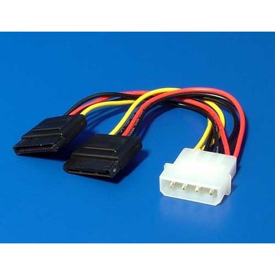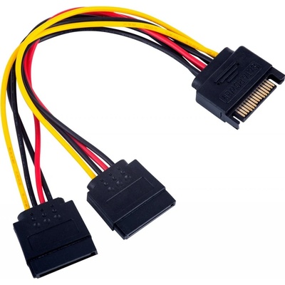 Redukce pro napájení 2 x Serial ATA zařízení.; Konektory: DC5,25M - 2x DC-SATA(F); Kabel: 4 oddělené kabely, AWG 20; Délka: 15cm; Barva: kabel 5V: červená kabel 0V: černá...