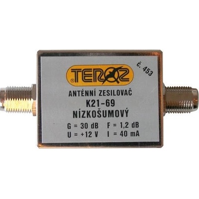 Anténní zesilovač TEROZ 453X, UHF, G30dB, F1,2dB, U100dBµV, F-F Zesilovač Teroz T453X je dvoutranzistorový zesilovač UHF (K21-69) s nízkošumovými vysokofrekvenčními tranzistory...