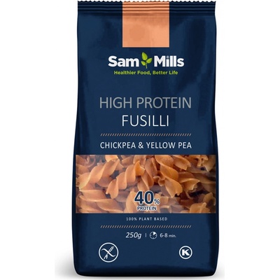 Sam Mills Fusilli vřetena z cizrny a žlutého hrachu 250g Těstoviny s vysokým obsahem proteinu z cizrny a žlutého hrachu - Vřetena (bez lepku, sušené, bezvaječné) Vysoký...