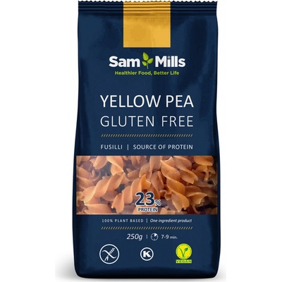 Sam Mills Fusilli těstoviny ze žlutého hrachu bez lepku 250g Sušené bezvaječné těstoviny ze žlutého hrachu. Bez lepku. Vysoký obsah bílkovin - 23 % bílkovin v jedné porci....