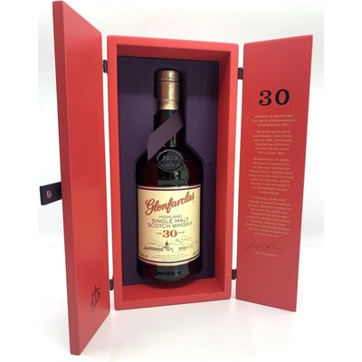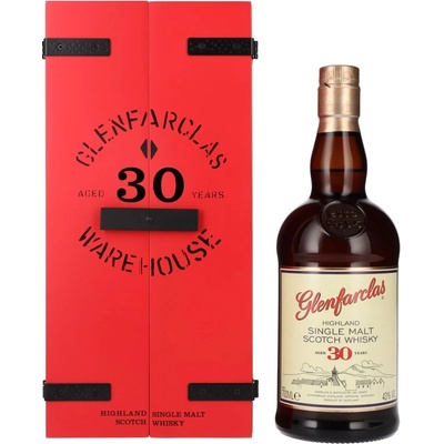Glenfarclas 30Y 43% Jednosladová skotská whisky z oblasti Speyside vyráběná palírnou Glenfarclas, která tuto verzi 30 leté whisky vydala v roce 2016, k příležitosti 180 letého výročí palírny. Barva je zlatě jantarová.V aroma je dominuje sherry, rozinky, káva a ovoce....