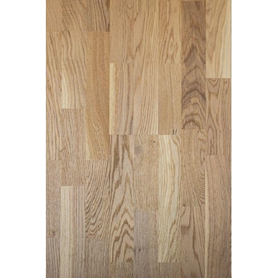 Třívrstvá dřevěná podlaha barvená do světlého odstínu s malým množstvím suků. Povrch podlahy je kartáčovaný a ošetřený matným lakem.