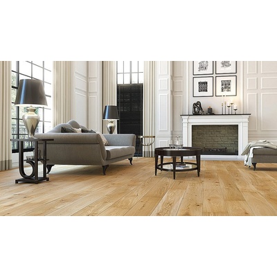 Třívrstvá dřevěná podlaha v přírodním odstínu dřeva s malým množstvím suků. Povrch podlahy je ošetřený olejem.