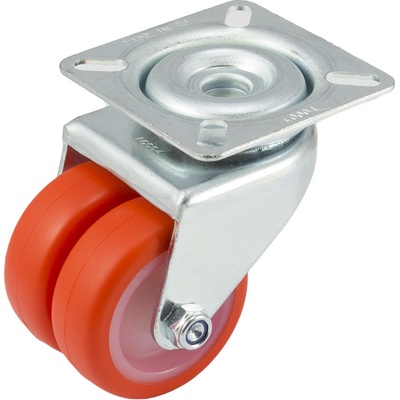 Plastové přístrojové dvojité kolečko s oranžovým polyuretanovým nešpinícím běhounem v otočné vidlici s uchycením na plotnu na čtyři šrouby Materiál: kolo PU - disk - bílý...