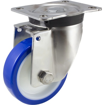 Transportní kolo s polyuretanovým běhounem v otočné nerezové vidlici s uchycením na čtyři šrouby Materiál: vidlice - z nerezového plechu, otáčivé ložisko s dvojitým kuličkovým...