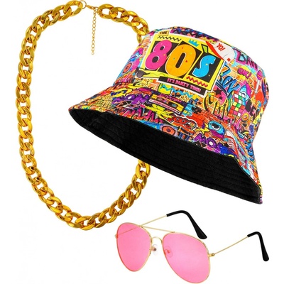 Sada 80. léta (klobouček, brýle, řetěz na krk) Vraťte se zpět v čase s touto sadou inspirovanou 80. léty. Tento stylový set obsahuje látkový klobouček s graffiti motivem, brýle...