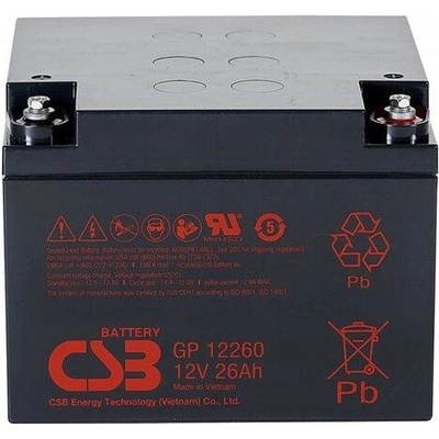 CSB GP12260I Záložní olověný akumulátor (12 V, kapacita 26 Ah) v provedení VRLA (AGM). Jde o konstrukci, při níž dochází k regulaci vnitřního tlaku pomocí ventilů (VRLA - Valve...