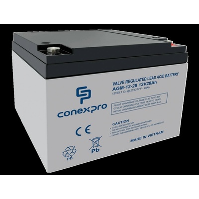 Hermeticky uzavřený olověný akumulátor Conexpro AGM-12-28 o kapacitě 28 Ah a napětí 12 V je vhodný pro zdroje nepřerušovaného napájení, požární, zabezpečovací, přístupové,...