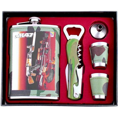 Placatka s pohárky AK47 kalašnikov | CCCP a Ruské suvenýry rozměry placatky: výška: 15 cmšířka: 9,5 cmtloušťka: 2,2 cm objem: cca 2,5 dclobjem pohárku: 2 cl specifikace: •...