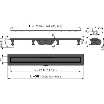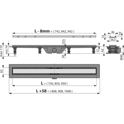 ALCAPLAST Flexible Low podlahový žlab s okrajem pro perforovaný rošt APZ1104-850 - s nastavitelným límcem ke stěně Délka žlabu: 850 mm Minimální tloušťka betonu: 55 mm Celková...