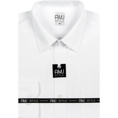 Košile s dlouhým rukávem od značky AMJ v bílé barvě s jemnou strukturou v barvě košile. Zapínání na modré knoflíky. Má kapsičku na levé straně hrudi a klasický rovný střih....