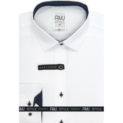 Společenská košile s dlouhým rukávem AMJ v užší střihu SLIM FIT. Košile v bílé barvě s jemnou strukturou. Košile bez kapsičky. Zapínání na knoflíky s tmavě modrým středem a...