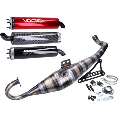 Voca Road Race výfuková soustava pro skútry s ležatým motorem Minarelli Pravá závodní výfuková soustava, speciálně navržená pro 70 ccm válce. Soustava je ručně svařená z 10 jednotlivých kuželů z ocelového plechu o tloušťce 0,8 mm. Díky tomu mohlo být rezonanční těleso...