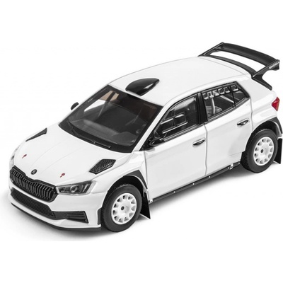Model vozu Škoda Fabia RS Rally2 v měřítku 1:43 v bílém provedení. Tento model má šotolinová kola.