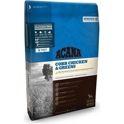 Acana Dog Cobb Chicken&Greens Heritage 2kg Výrobce: Champion Petfoods LTD. PRO VŠECHNA PLEMENA A VĚKOVÉ KATEGORIE PŘIPRAVOVÁNO V NAŠICH OCEŇOVANÝCH KUCHYNÍCH V KANADĚ. ACANA COBB CHICKEN & GREENS PŘEKYPUJE ČERSTVÝMI MÍSTNÍMI SUROVINAMI VČETNĚ VOLNĚ CHOVANÝCH KUŘAT,...