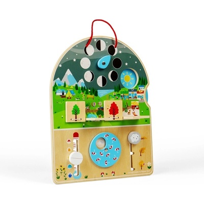 Dřevěný kalendář na této desce je hračkou, se kterou se dítě naučí názvy různých typů počasí, jako je slunečno, zataženo, déšť, sníh a vítr. Každé roční období se vyznačuje...