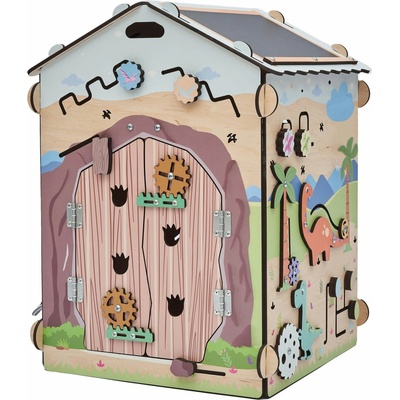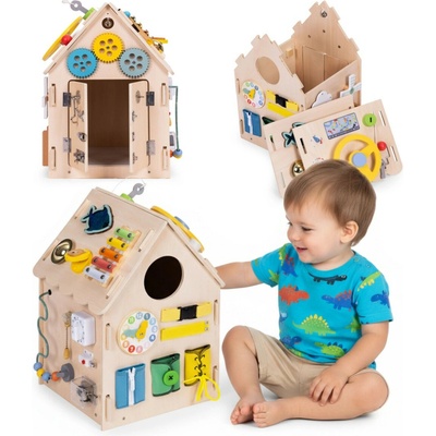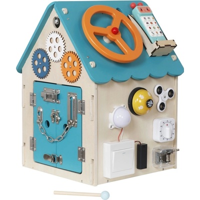 domeček, hrací prvky tvoří vypínač, ozubená kolečka, zámek, přezky a tkaničky, cestovní, vhodné od 3 let, dřevěná konstrukce, materiál hracích prvků dřevo, plast a kov, rozměry...