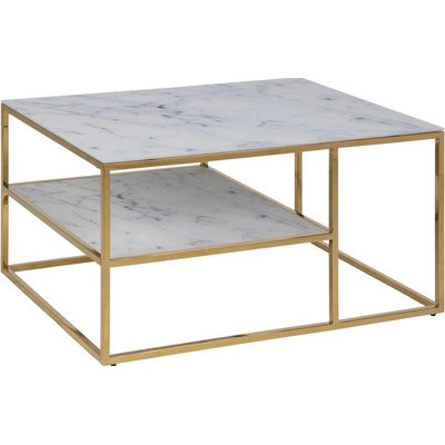 Alisma bílo / zlatý čtvercový stůl od výrobce Actonaje kombinací moderního designu, geometrického tvaru, elegance a funkčnosti,Mramorový vzor a kovová základna se vyznačuje moderním designem,Deska stolu je vyrobena z 6 mm skla o velikosti 50x50 s imitací mramoru a...
