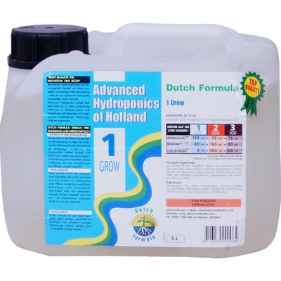 Advanced Hydroponics - Dutch Formula Grow 5l Doporučená kombinace nizozemských formulí 1, 2 a 3 během 18 hodinového vegetačního období je nejlepší zárukou kvalitních výsledků a silných, zdravých rostlin se svěží zelenými listy. Holandská formule GROW vytváří vrcholové...