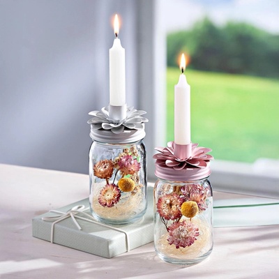 Sada dvou skleněných svícnů s víčkem ve tvaru květiny a nádherným vnitřním aranžmá ze sušených květin. Krásná i funkční dekorace, která ozdobí jakýkoliv interiér. Každý svícen...