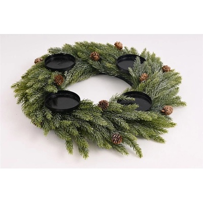 Adventní svícen s mini šiškami k dodekorování. Rozměry: 43 x 43 x 6 cm. Materiál: plast, kov. Barva: zelená.