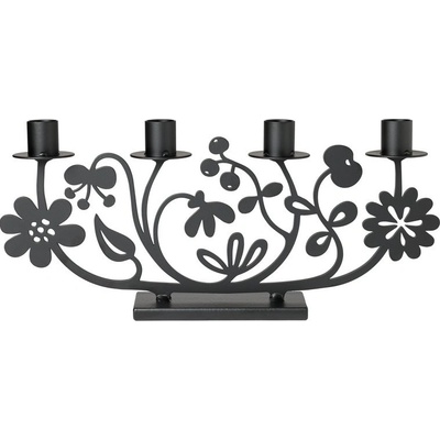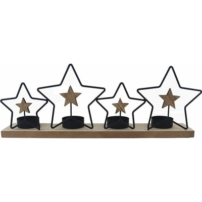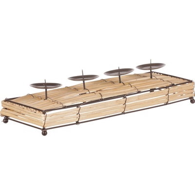 Adventní svícen. Rozměry: 34,5 x 6 x 12 cm. Materiál: kov, dřevo. Barva: černá, hnědá. Upozornění: Nenechávejte zapálené svíčky bez dozoru. Určeno do interiéru.