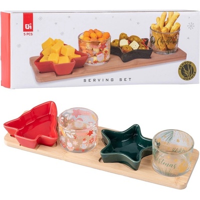 Pět barevných skleněných svícnů na bambusovém tácku – adventní a dekorativní.
