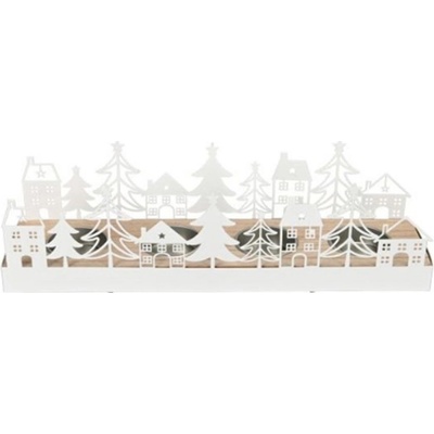 Adventní svícen. Rozměry: 30 x 7 x 9 cm. Materiál: dřevo, kov. Barva: bílá, přírodní. Upozornění: Nenechávejte zapálené svíčky bez dozoru. Dekorace je určena do interiéru. .
