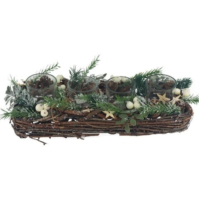 Dekorační svícen na 4 svíčky. Rozměry: 36 x 13 x 8 cm. Materiál: přírodní, plast, sklo. Barva: zelená, přírodní, bílá. Upozornění: Nenechávejte zapálené svíčky bez dozoru....