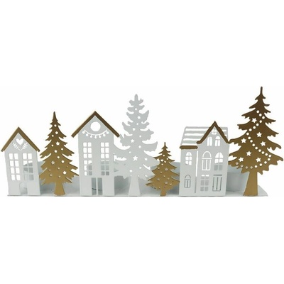 Dekorační adventní svícen. Rozměry: 26 x 5,5 x 10,5 cm. Materiál: kov. Barva: bílá, zlatá. Upozornění: Nenechávejte zapálené svíčky bez dozoru. Dekorace je určena do...