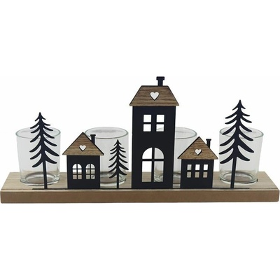 Dekorační adventní svícen. Rozměry: 34 x 7 x 15,5 cm. Materiál: dřevo, kov, sklo. Barva: přírodní, černá. Upozornění: Nenechávejte zapálené svíčky bez dozoru. Dekorace je...