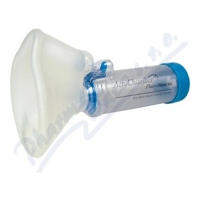 Antistatický inhalační nástavec AeroChamber Plus s ventilem,s indikátorem inspiračního průtoku Flow-Vu a maskou pro dospělé, pro inhalační podávání léků (vdechování). Léky se dostávají přímo do dýchacích cest, kde mají velký léčebný účinek a minimální ne