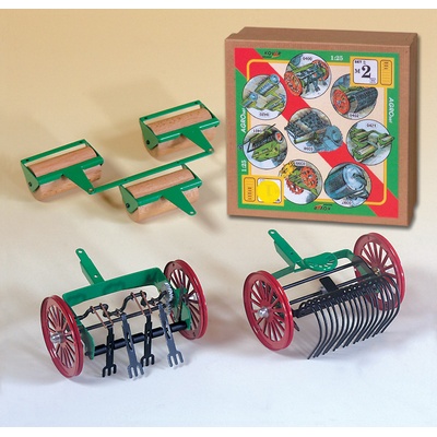 Agro set obsahuje pohrabovadlo, obracečku, dřevěné válce. Tato přívěsná zařízení patří k příslušenství zemědělských strojů, které jsou stejně jako ostatní hračky české firmy...