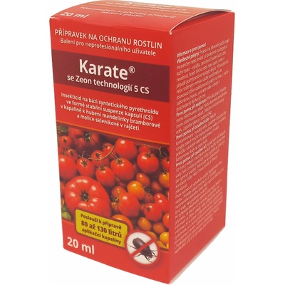 Karate Zeon 5 CS - 20 ml insekticid Agrobio Popis a působení:Karate je postřikový insekticidní přípravek ve formě syntetického pyrethroidu ve formě stabilní suspenze kapsulí v kapalině k hubení savého a žravého hmyzu v obilninách, hrachu, bobu, řepce olejce, hořčici...