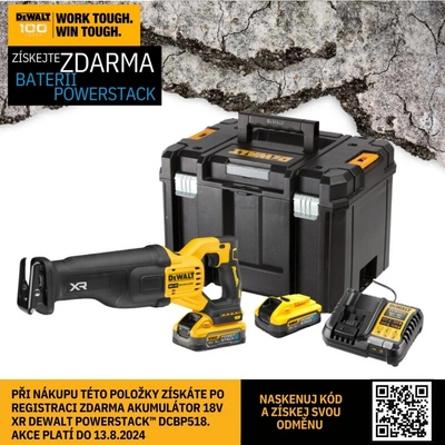 Aku mečová pila 18V DeWALT s rychloupínáním pilového plátu, vhodná pro práci na těžko dosažitelných místech. Akumulátor s kapacitou 1,7 Ah POWERSTACK. Kufr Tstak.Kompaktní...