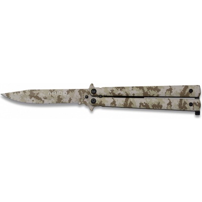 nůž - motýlek ALBAINOX ARIDO délka ostří: 10 cm délka rukojeti: 12,2 cm celková délka: 22,2 cm materiál: ocel 3Cr13Mov barva: CAMO Arido hmotnost: 137 g