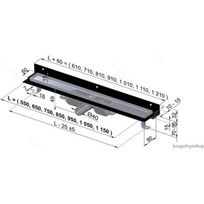 minimální tloušťka betonu 55 mm celková stavební výška 70-96 mm šířka koryta žlabu 60 mm průtok žlabu (ČSN EN 1253) 44 l/min odpadní potrubí Ø40 třída zatížení (ČSN EN 1253) K3 posun límce 1015 mm materiál tělo žlabu (ČSN 17240) Nerezová ocel DIN...