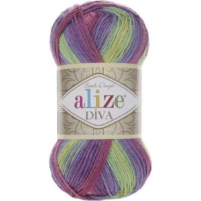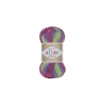Příze Alize Diva Batik Slabší lesklá příze vhodná na pletení a háčkování letních tílek, šatů, šátků, čepic, kloboučků. složení: 100% akryl - mikrovlákno hmotnost: 100 g návin: 350 m doporučené jehlice: 2,5 - 3,5 doporučený háček: 1-3