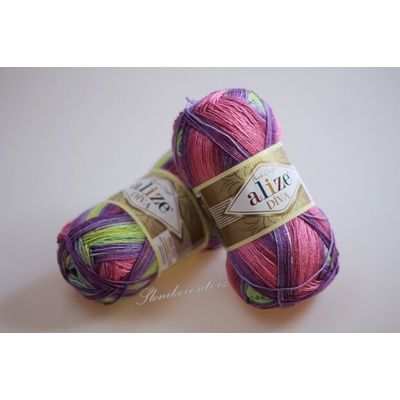 Alize Diva Batik je oblíbená, lesklá příze v nádherných melírovaných barvách, složená ze 100% akrylového mikrovlákna, vhodná pro pletení i háčkování letních úpletů, čepiček, triček, šatů, kloboučků a podobně s návinem 350 metrů. Váha 100g. Přibližná spotřeba na svetr...