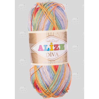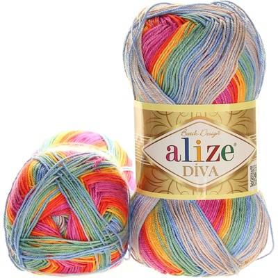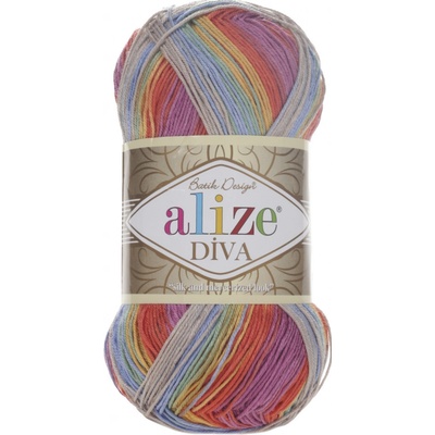 Alize Diva Batik je oblíbená, lesklá příze v nádherných melírovaných barvách, složená ze 100% akrylového mikrovlákna, vhodná pro pletení i háčkování letních úpletů, čepiček, triček, šatů, kloboučků a podobně s návinem 350 metrů. Váha 100g. Přibližná spotřeba na svetr...