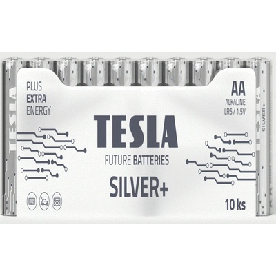 TESLA SILVER+ AA (LR06) 10 ks; Alkalické baterie formátu AA s napětím 1,5 V. V jednom balení je 10 kusů baterií. ZÁKLADNÍ SPECIFIKACE Formát: AA Technologie: alkalická...