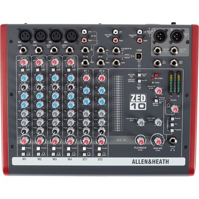 Allen&Heath ZED-10 • 4x mikrofonní/linkový vstup • 2x duální stereo vstup • předzesilovače DuoPre™ s rozsahem zisku 69dB • 2x Hi-Z vstup • phantomové napájení 48V • 2x AUX • USB vstup/výstup • HPF filtr • stereo return • 2-track return • sluchátkový výstup Jack 6,3mm •...