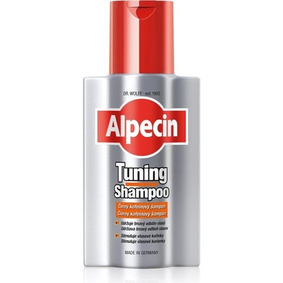 ALPECIN Tuning Shampoo - tuning vlasů při každém mytí - udržuje tmavé vlasy tmavé a díky obsaženému kofeinovému komplexu zabraňuje dědičně podmíněnému vypadávání vlasů. Intenzivní pigmenty oživují přirozený odstín tmavých vlasů a matují první šediny.