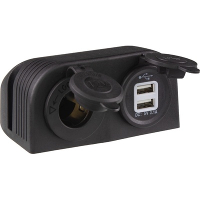 Dvojitá zásuvka s panelem 1x CL + 2x nabíječka USB voděodolná. Technické parametry: • napájecí napětí: 12 V / 24 V • max. výstup USB: 5V / 3,1 A • rozměry: š 91,8 mm x v 45,3...