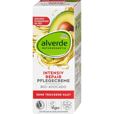alverde NATURKOSMETIK krém na ruce Intensiv s obsahem složení s cenným olejem z granátového jablka a bambuckého másla podporuje regeneraci suché, namáhané a popraskané pokožky,...
