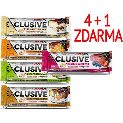 AmixTM Exclusive Protein bar Čisté množství: 85g, 40g Příchutě: Pomeranč & Čokoláda, Banán & Čokoláda, Karibský Punch, Double Dutch Chocolate, Forest Fruit, Mocca Choco Coffee, Peanut Butter Cake, Ananas & Kokos, Pistácie & Karamel, Bílá čokoláda & Kokos Dovolujeme...