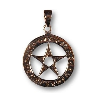 Bronzový amulet ve tvaru pentagramu, po obvodu má vepsán runový nápis. Průměr šperku je cca 2 cm.