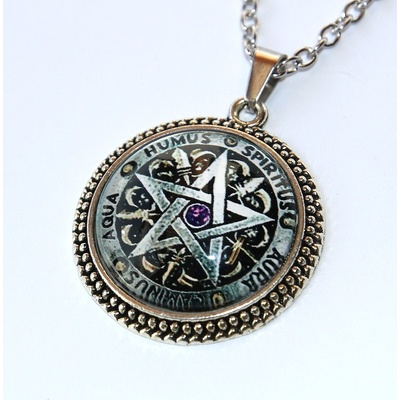 Materiál: speciální slitina kovů, která nezpůsobuje alergické reakce - v amuletu je zasazen kámen od Swarovskiho. V setu je řetízek na krk a dárková krabička. Velikost: průměr 3,9 cm Původ: Není přesně doložen. Symbolika: Pentagram je nejuctívanější magický symbol....