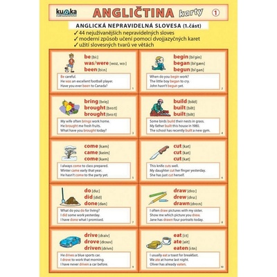 Karty k procvičování nepravidelných sloves včetně jejich užití ve větách. Obsahuje 44 nejužívanějších nepravidelných sloves, záložku se všemi tvary sloves a gramatickou záložku...