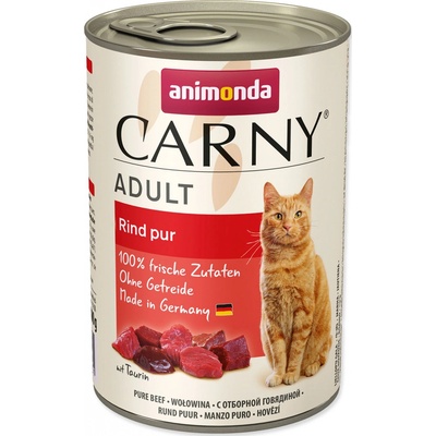 Animonda Carny Adult s hovězím a kuřecím masem a kachní srdeční svalovinou je mokré krmivo bohaté na bílkoviny a taurin. Bez sóji a cukru.